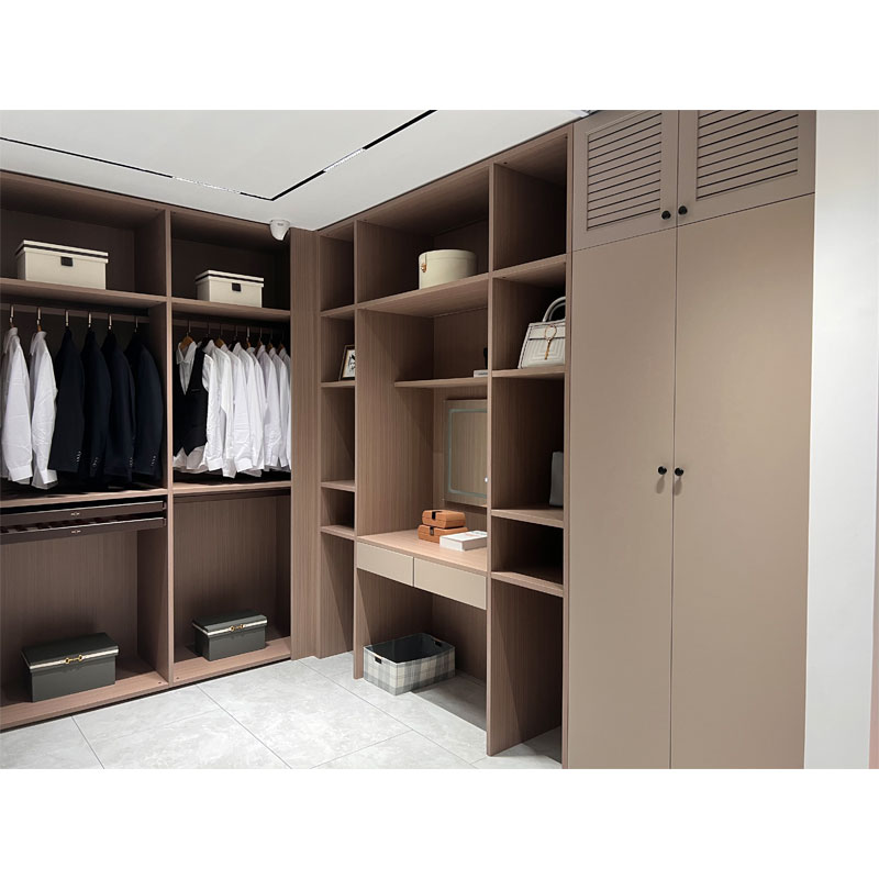 இந்த அலமாரியானது பொதுவான பாகங்கள் மற்றும் ஆடைகளுக்கான திறந்த சேமிப்புப் பகுதியுடன் வடிவமைக்கப்பட்டுள்ளது, மேலும் சுருக்கங்களைத் தவிர்க்க சட்டைகள், ஜாக்கெட்டுகள் மற்றும் பேன்ட்களை நேரடியாக துணி தண்டவாளங்களில் தொங்கவிடலாம்.