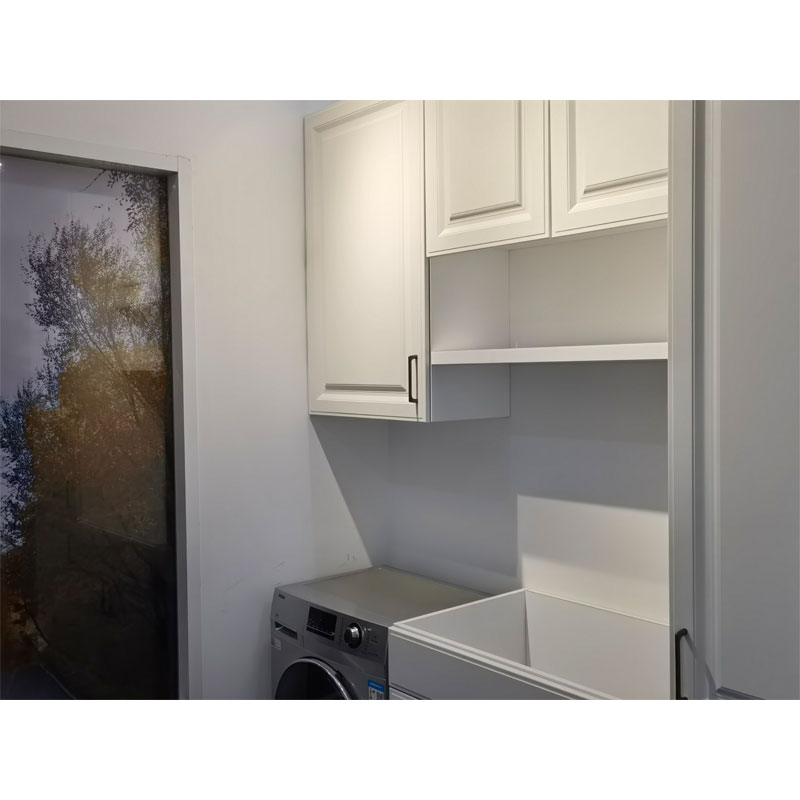 SINOAH லேமினேட் செய்யப்பட்ட வெள்ளை சலவை பெட்டிகளின் புதிய தொகுப்பை அறிமுகப்படுத்துகிறது. வெள்ளை பெட்டிகள் மிகவும் சுத்தமாகவும் சுத்தமாகவும் இருக்கும், மேலும் அறையை பார்வைக்கு விசாலமாகவும் பிரகாசமாகவும் ஆக்குகிறது. குழிவான மற்றும் குவிந்த கேபினட் கதவுகள் மற்றும் கருப்பு உலோக கைப்பிடிகள் மிகவும் ஸ்டைலான மற்றும் நேர்த்தியானவை மற்றும் எளிதில் தோற்றமளிக்காது. திறந்த அலமாரிகள் மற்றும் மூடிய அலமாரிகளின் கலவையானது முழு இடத்தையும் மேலும் தடுமாறச் செய்கிறது.