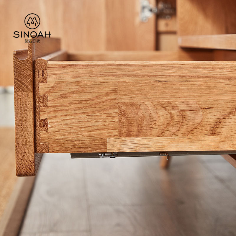 சுற்றுச்சூழலுக்கு உகந்த திறந்த வண்ணப்பூச்சு வெள்ளை ஓக்கின் உண்மையான அமைப்பை நன்றாக வைத்திருக்கிறது. இயற்கையின் புத்துணர்ச்சி மற்றும் திறந்த தன்மையை நீங்கள் வீட்டில் அனுபவிக்க முடியும். அதே நேரத்தில், வெள்ளை ஓக் வலுவான சுமை தாங்கும் திறன் கொண்டது. கோடுகளின் வடிவமைப்பு எளிமையானது என்றாலும், செயல்பாடுகள் மிகவும் நடைமுறை மற்றும் அளவு நீளமானது. சேமிப்பு இடம் பல்வேறு குறிப்புகள் உணவுக்கு இடமளிக்கும் மற்றும் வாழ்க்கையின் அனைத்து தேவைகளையும் பூர்த்தி செய்ய முடியும். திறந்த சேமிப்பு பொருட்களை சேமிப்பது மட்டுமல்லாமல், வாழ்க்கையை அலங்கரிக்கவும் முடியும். பல இழுப்பறைகளுடன், சண்டிரிகளை அதில் உள்ளடக்கி, வீட்டை சுத்தம் செய்யலாம்