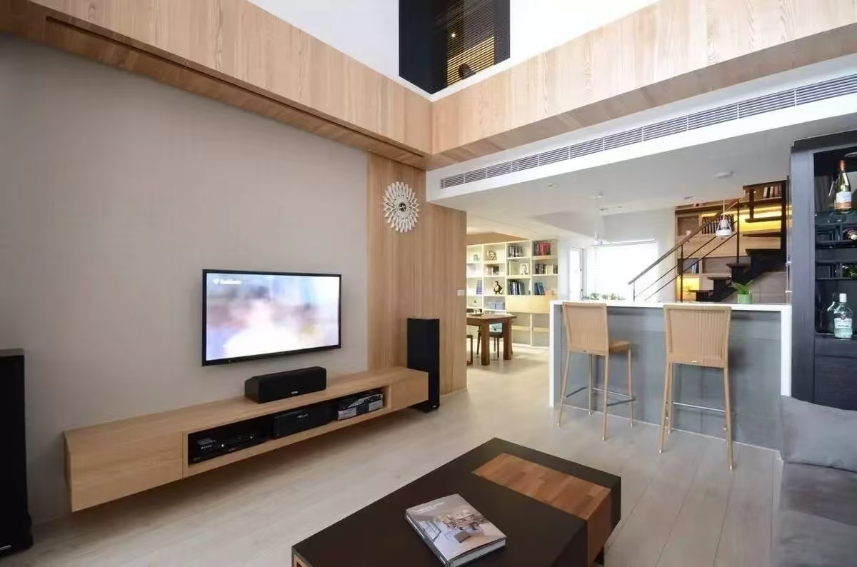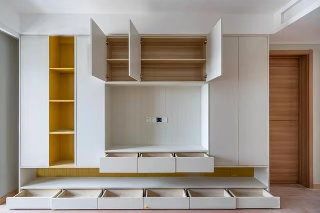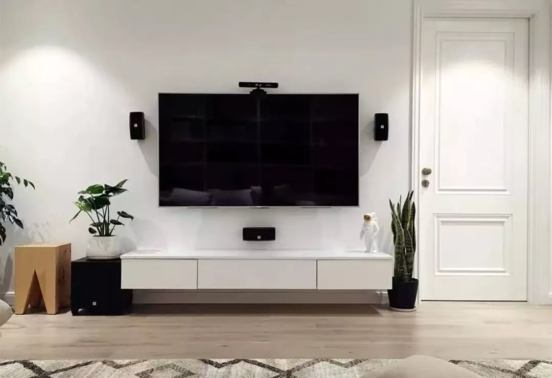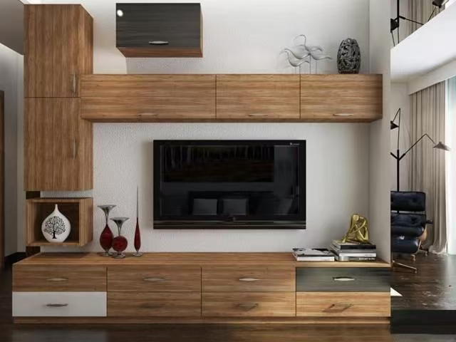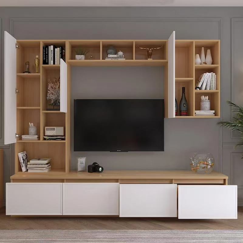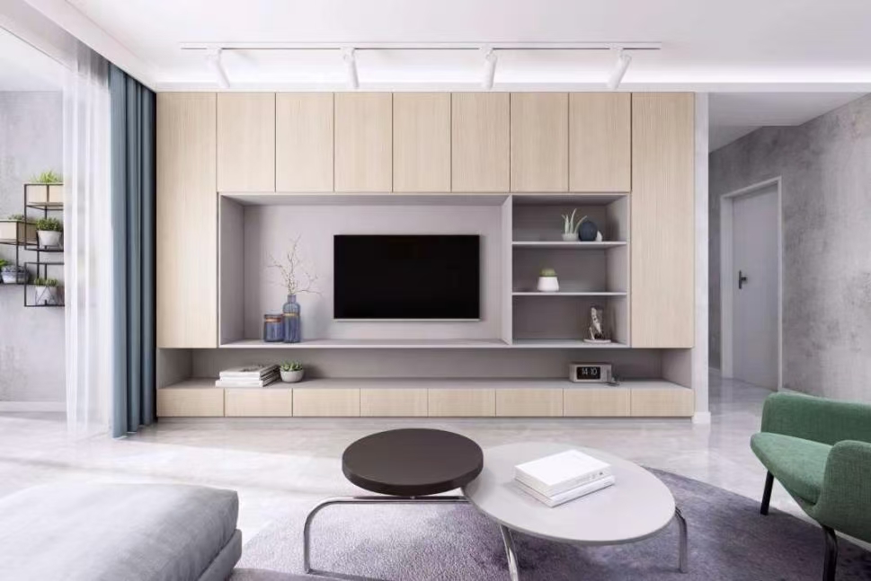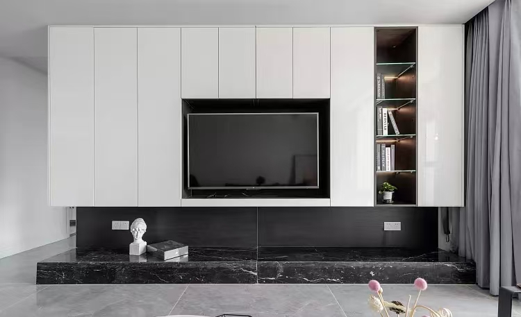 நீங்கள் தொலைக்காட்சியை மையமாகப் பயன்படுத்தலாம் மற்றும் அதை சுவர் பொருத்தப்பட்ட பெட்டிகளும், தரை பெட்டிகளும், சேமிப்பக பெட்டிகளும் இணைக்கலாம், மேலும் அடுக்கு மற்றும் நடைமுறை வடிவமைப்பை உருவாக்கலாம்.