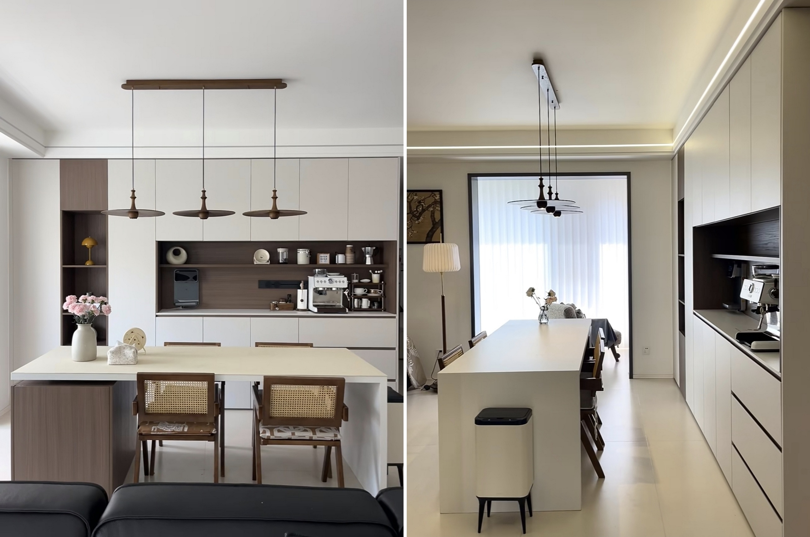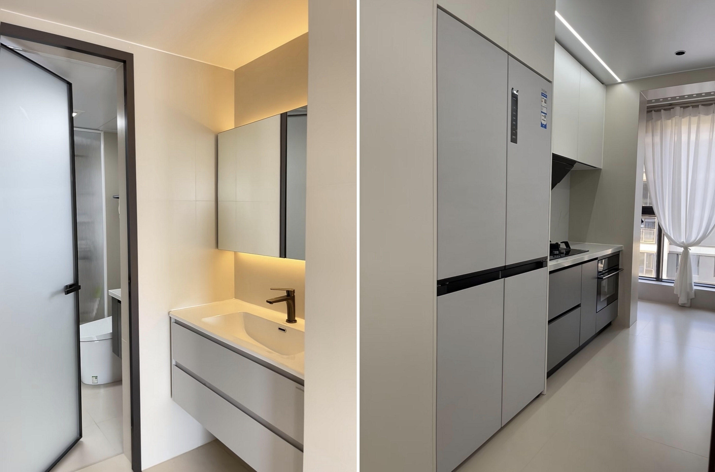 பால்கனியின் நெகிழ் கதவு மற்றும் ஒரு படுக்கையறை சுவர் ஆகியவை அகற்றப்பட்டுள்ளன. இடிக்கப்பட்ட படுக்கையறை ஒரு ஆய்வாக மாற்றப்பட்டுள்ளது, ஒரு பாக்கெட் கதவு திறந்திருக்கும் போது கதவை மறைக்க வடிவமைக்கப்பட்டுள்ளது, திறந்த-திட்ட ஆய்வை உருவாக்குகிறது, மேலும் மூடும்போது ஒரு தனியார் இடத்தை வழங்குதல், நெகிழ்வுத்தன்மை மற்றும் பல்துறைத்திறனை வழங்குகிறது.